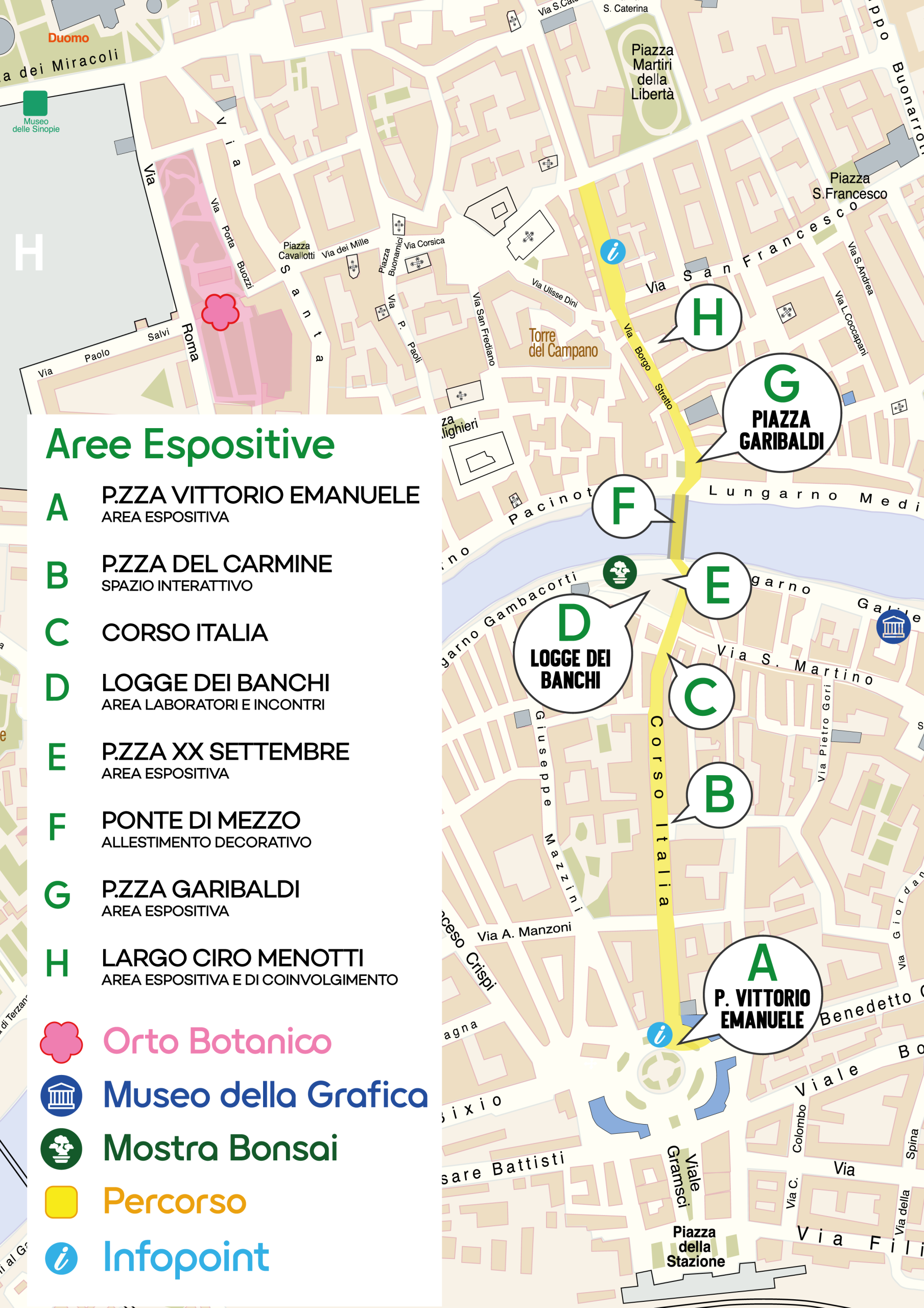 La manifestazione si sviluppa tra Piazza Vittorio Emanuele II, Corso Italia, Piazza XX Settembre, Logge di Banchi, Ponte di Mezzo, Piazza Garibaldi, Borgo Stretto e Via Oberdan